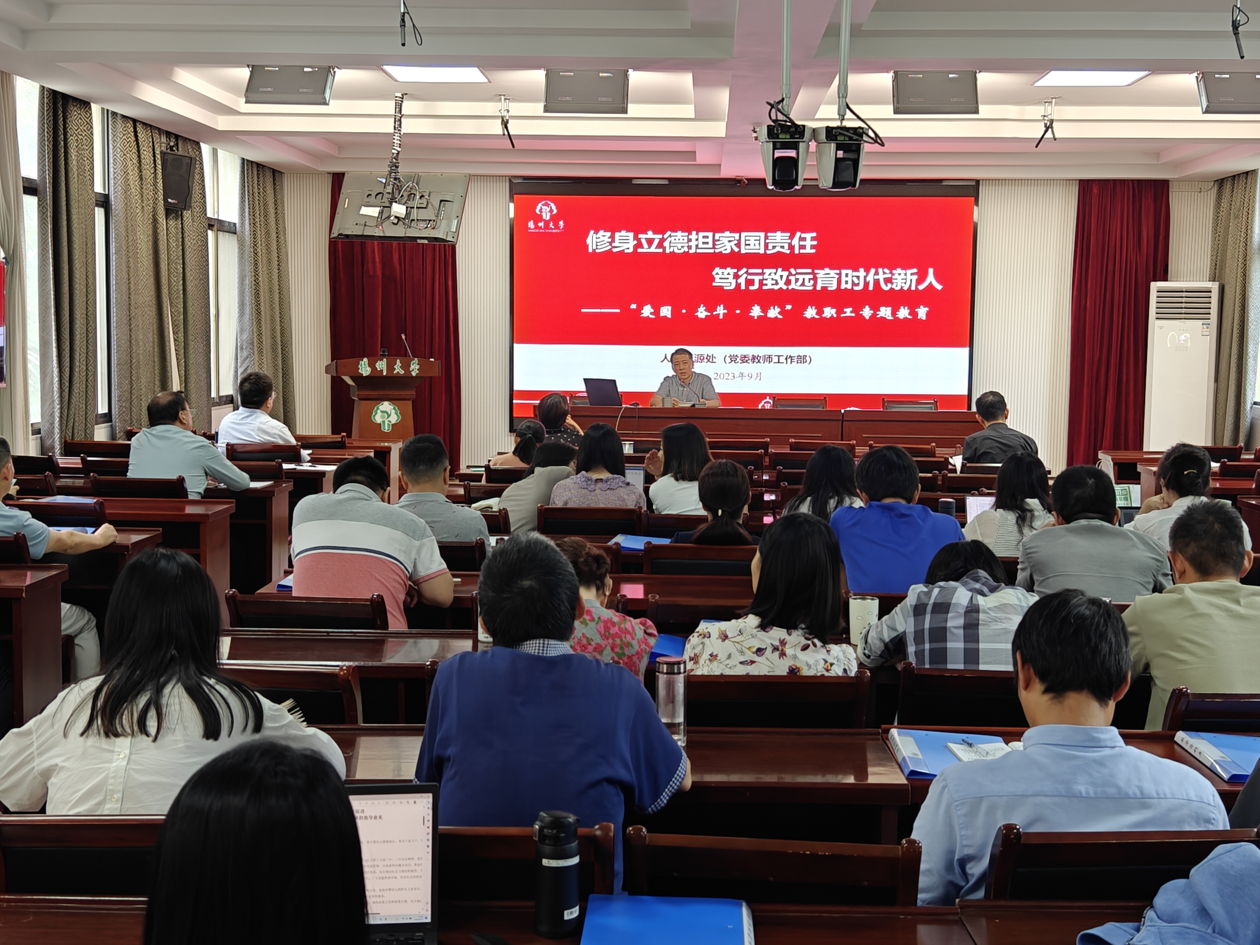 杨咏以“修身立德担家国责任,笃行致远育时代新人”为题,深入领学《新时代高校教师职业行为十项准则》《扬州大学师德失范行为负面清单及处理办法》等文件,以教育部公开曝光第十二批、十三批违反教师职业行为十项准则典型为反面教材,结合习近平总书记在第五次中央政治局集体学习时的重要讲话精神和第39个教师节重要指示精神,强调全院教职工要胸怀“国之大者”,树立躬耕教坛、强国有我的志向抱负;要涵养高尚师德,争做培根铸魂、立德树人的优秀示范;要弘扬师道精神,倡树学有榜样、行有示范的先进典型。