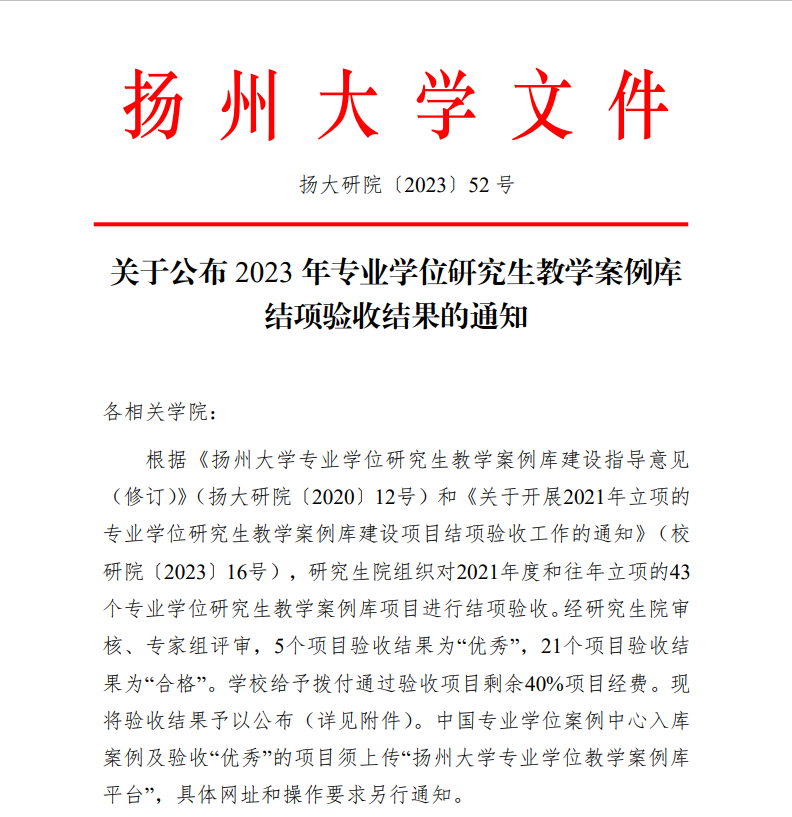 近期,研究生院公布了2023年专业学位研究生教学案例库结项验收结果,我院查永军、陈四光、王艳老师的案例获中国专业学位案例中心入库案例。