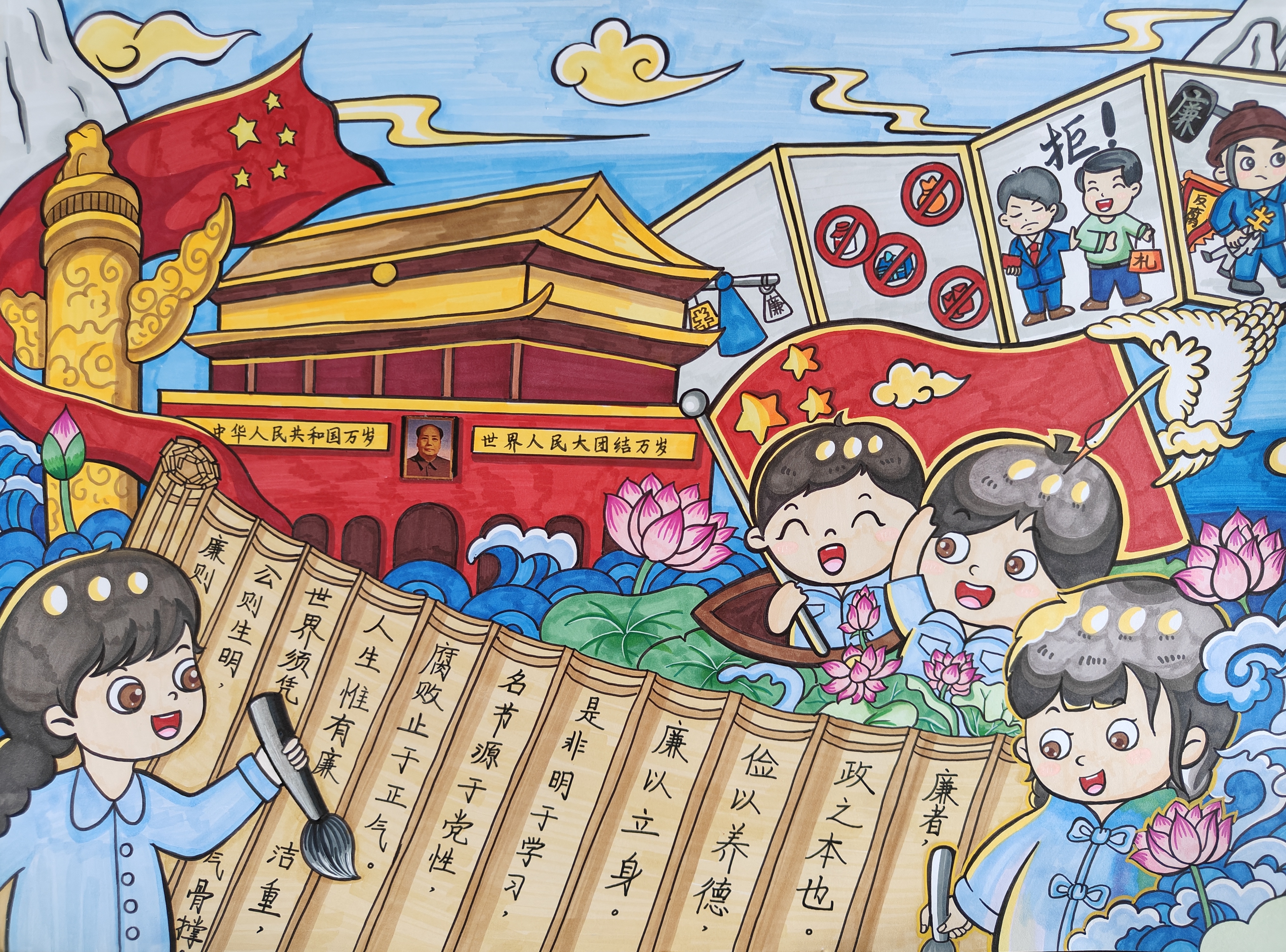 学生精心设计,以图绘廉,以文述廉,通过一句句发人深省的名言警句,一张张内容丰富的廉政小报,充分表达了对廉洁文化的认识。