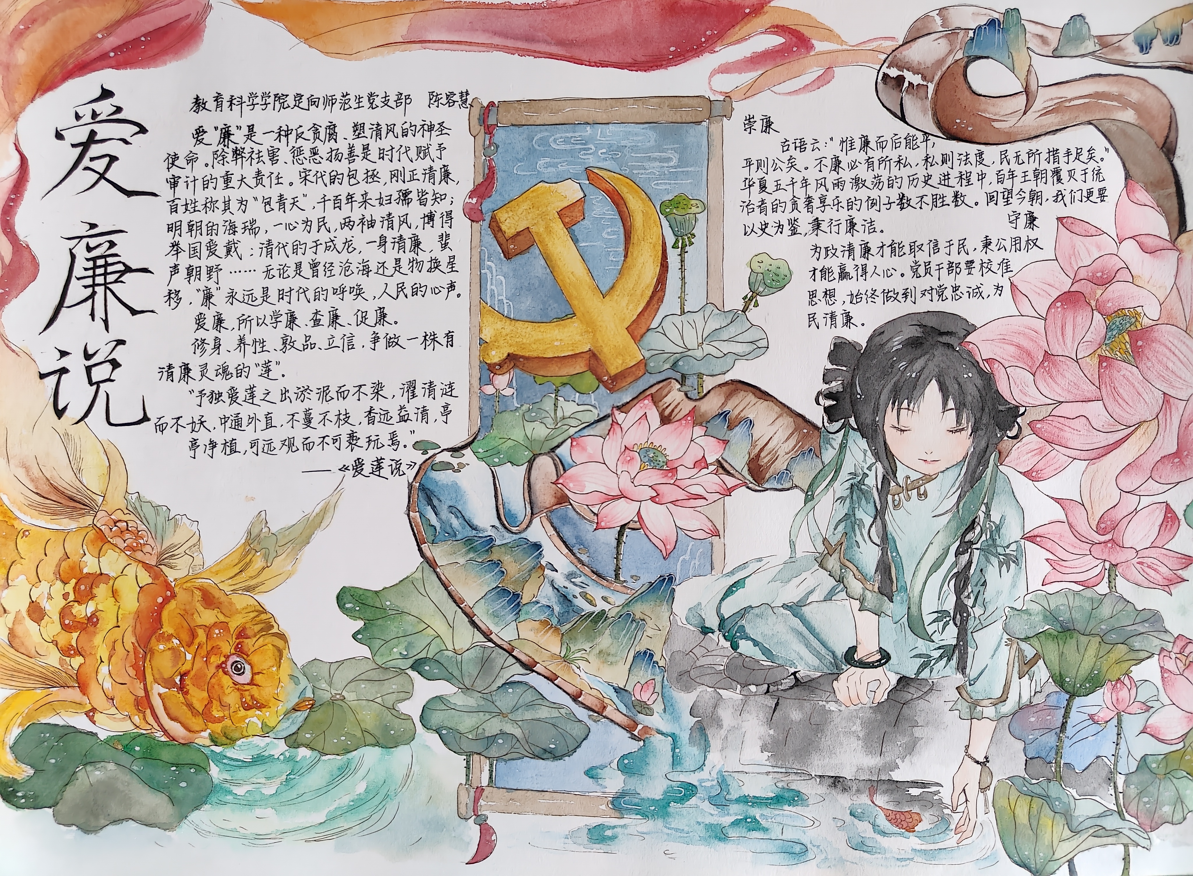 为进一步加强学生廉洁自律意识,提高学生思想政治素质,营造风清气正、崇廉尚洁的校园文化氛围,我院举办“清风廉韵”手抄报比赛。经由学生支部推荐,累计收集29件作品,最终评选出一等奖2名、二等奖6名、三等奖8名。