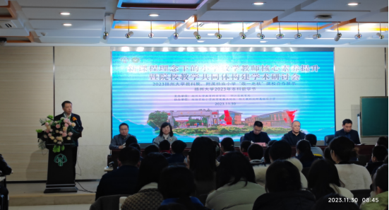 11月30日,我院和邗江区教育局在瘦西湖校区举办2023年本科教学节系列活动之“敬一之秋”院校合作展示活动。学院党委书记杨咏、邗江区教育局副局长张昕代表主办方致辞,教务处副处长张来、学院领导班子、维扬实验小学教育发展共同体、附属杨庙小学参加本次活动。