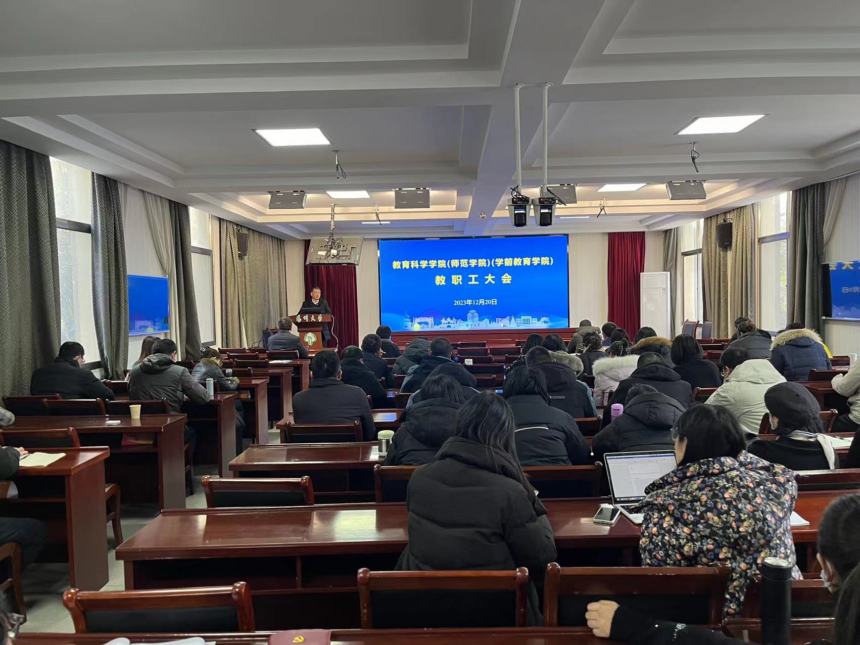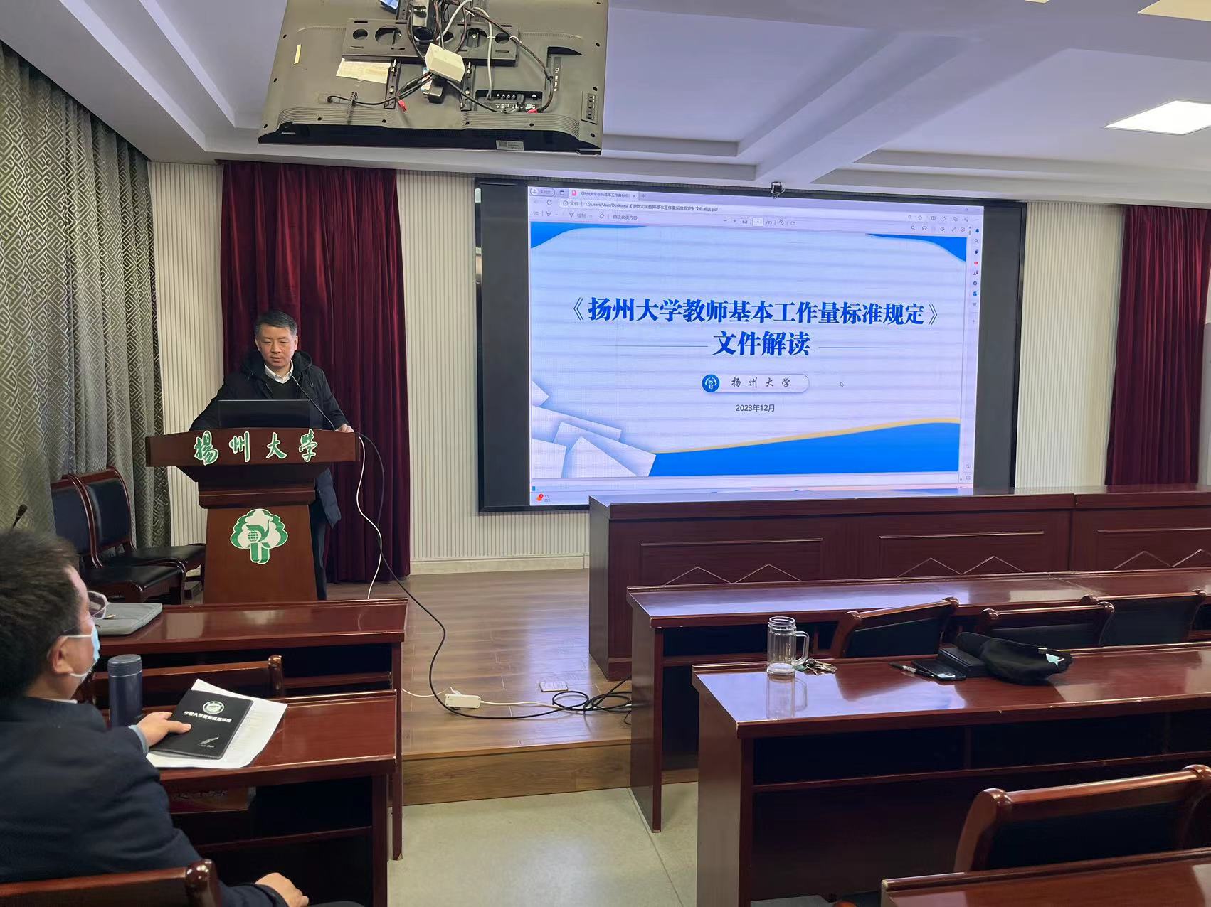 12月20日下午,学院在65号楼二楼报告厅召开教职工大会,院党委书记杨咏主持会议。会上,杨咏书记带领大家系统学习了《扬州大学教师基本工作量标准规定》,并就有关重点内容进行了深度解读。查永军院长传达了学校《关于开展教职工在岗考勤专项检查的通知》精神,朱鑫铨、曹玉兰、刘牧等院领导重点部署了学期末学院各项工作。