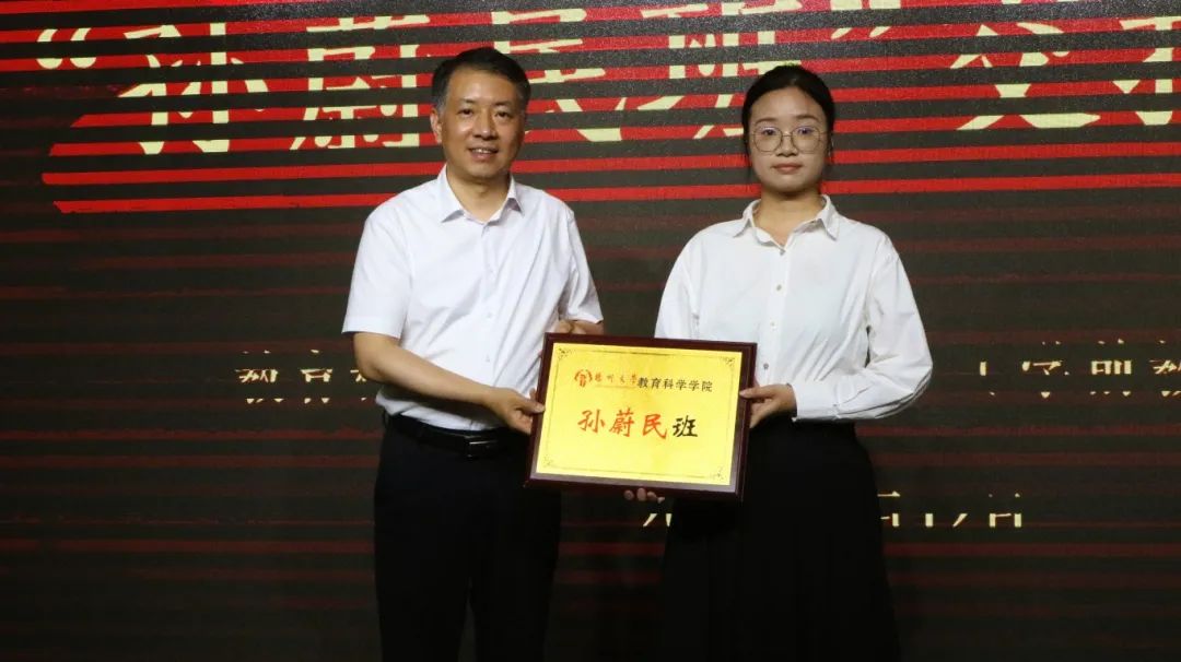 “胸怀天下,以文化人……”小教2005班全体同学的朗诵《慧泽颂声》体现了学生们对传统师道文化中教育家精神的体悟,同学们牢记为党育人、为国育才的初心使命,树立躬耕教坛、强国有我的理想抱负。在琅琅诵声的余韵中,小教2302班班长戴文静同学从院党委书记杨咏老师手中接过班牌,未来将进一步赓续孙蔚民精神,将先生精神发扬光大。