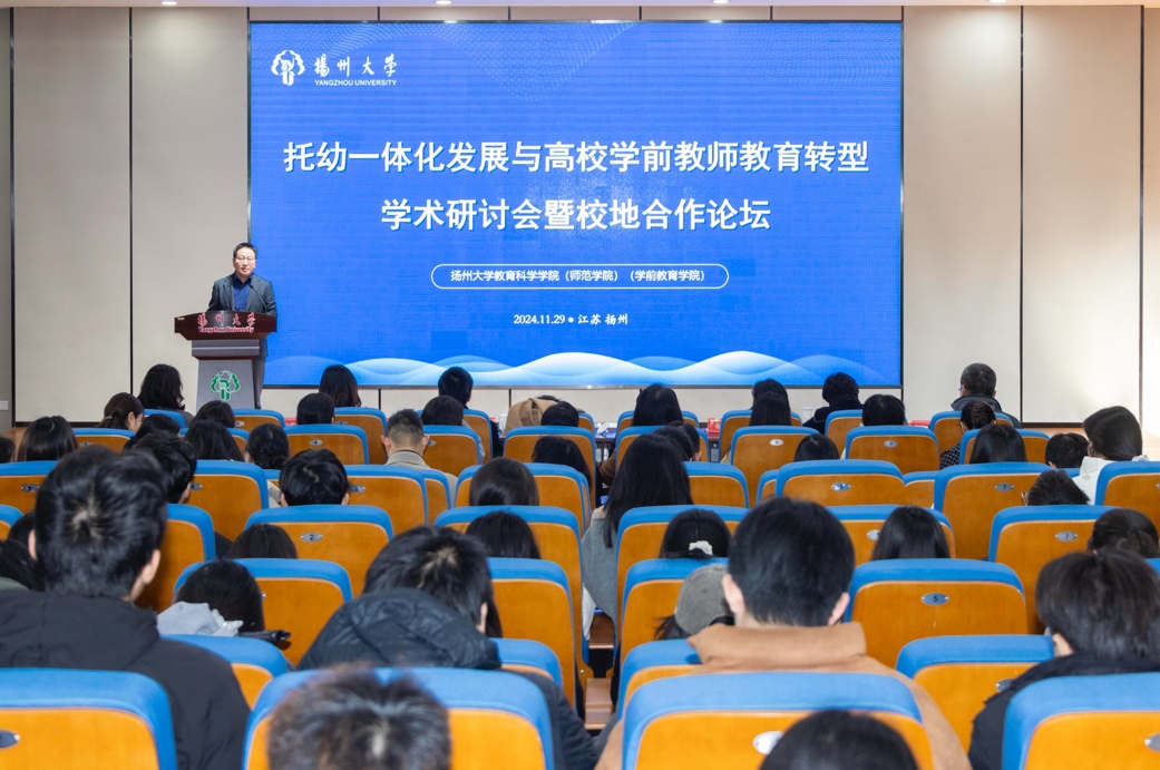 11月29日下午,学院举办“托幼一体化发展与高校学前教师教育转型”学术研讨会暨校地合作论坛。扬州大学副校长龚卫娟出席会议并讲话,扬州大学研究生院院长薛怀国、教务处处长严长杰,以及省内知名幼儿园园长、教研员和幼教干部,学前教育领域的专家,学院全体院领导、学前教育系全体教师、研究生和本科生150余人参与了本次会议。会议由副院长刘牧主持。