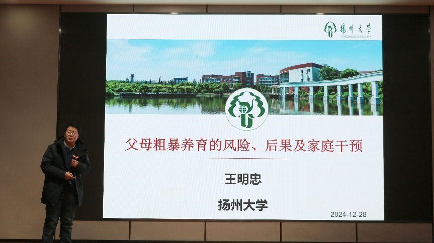 扬州大学教授、博士生导师王明忠作了题为《父母粗暴养育的风险、后果及家庭干预》的学术报告。从心理学角度深入探讨了父母粗暴养育对儿童心理发展的负面影响,特别是对儿童行为模式、情感发展以及社会适应能力的长远影响。报告中,王教授通过大量的实证研究数据,揭示了粗暴养育的潜在风险因素,并提出了相应的干预手段,包括如何正确运用家庭教育方法、如何通过亲子沟通建立和谐的家庭关系等,得到了与会者的高度认同。