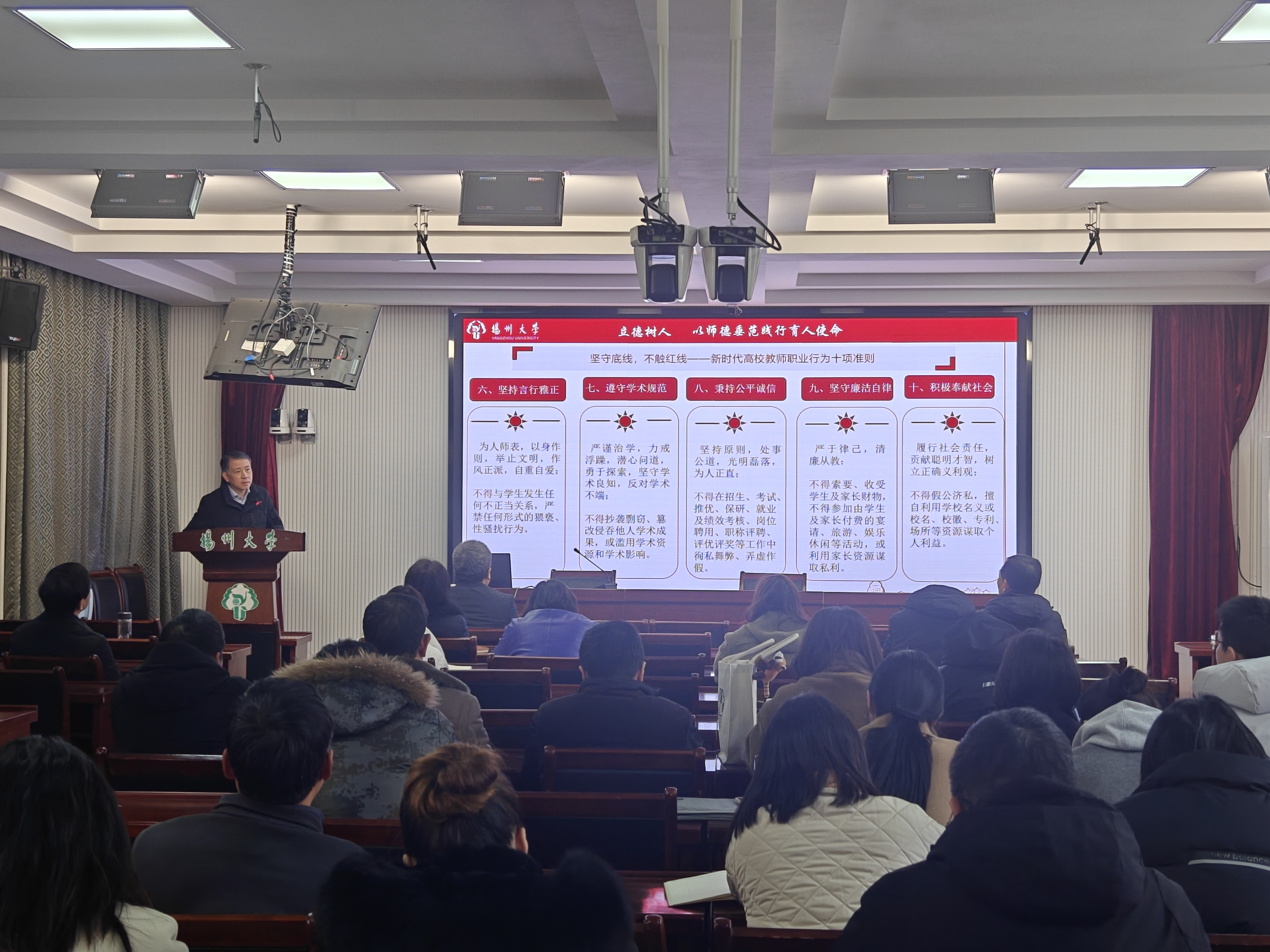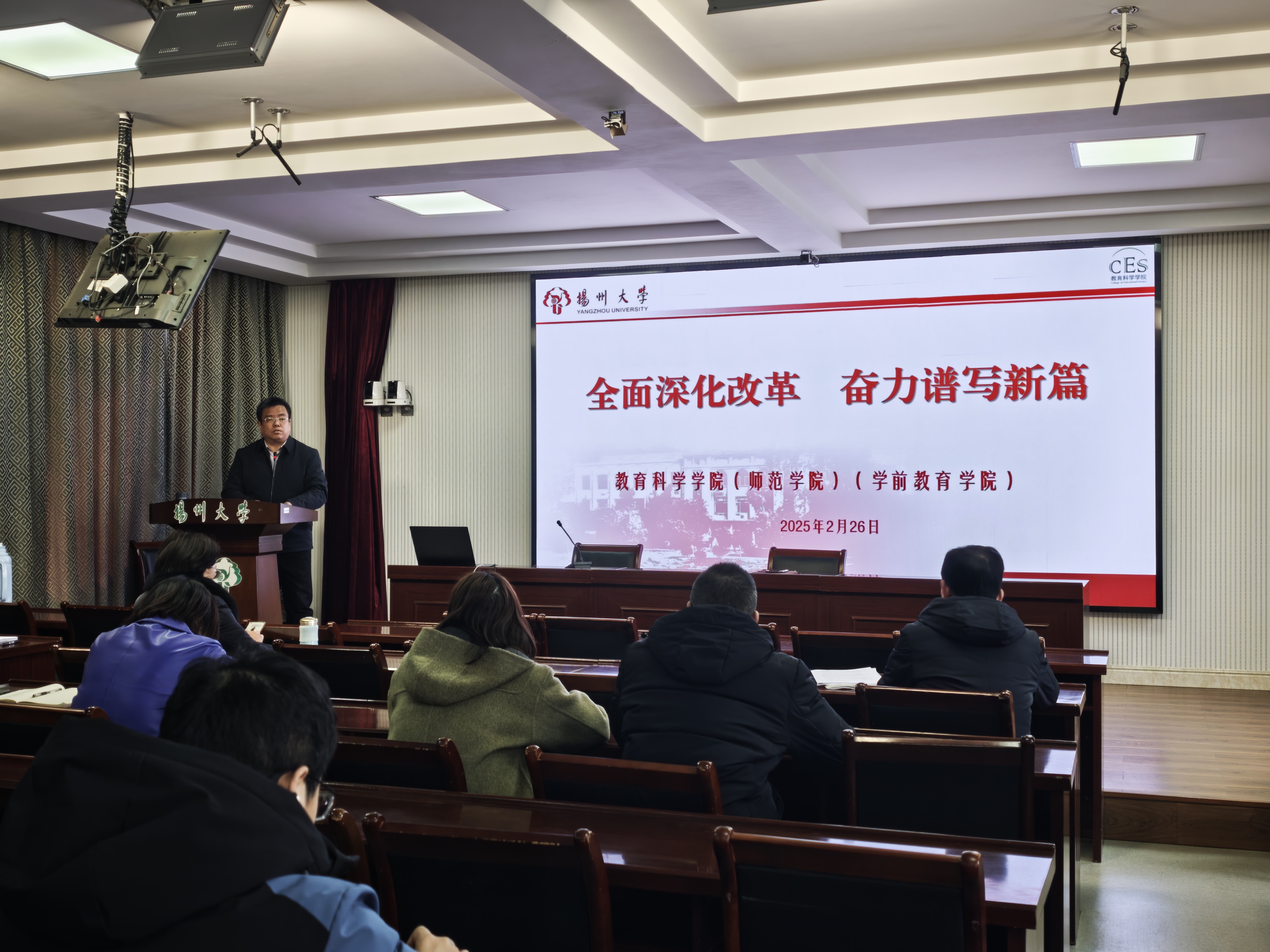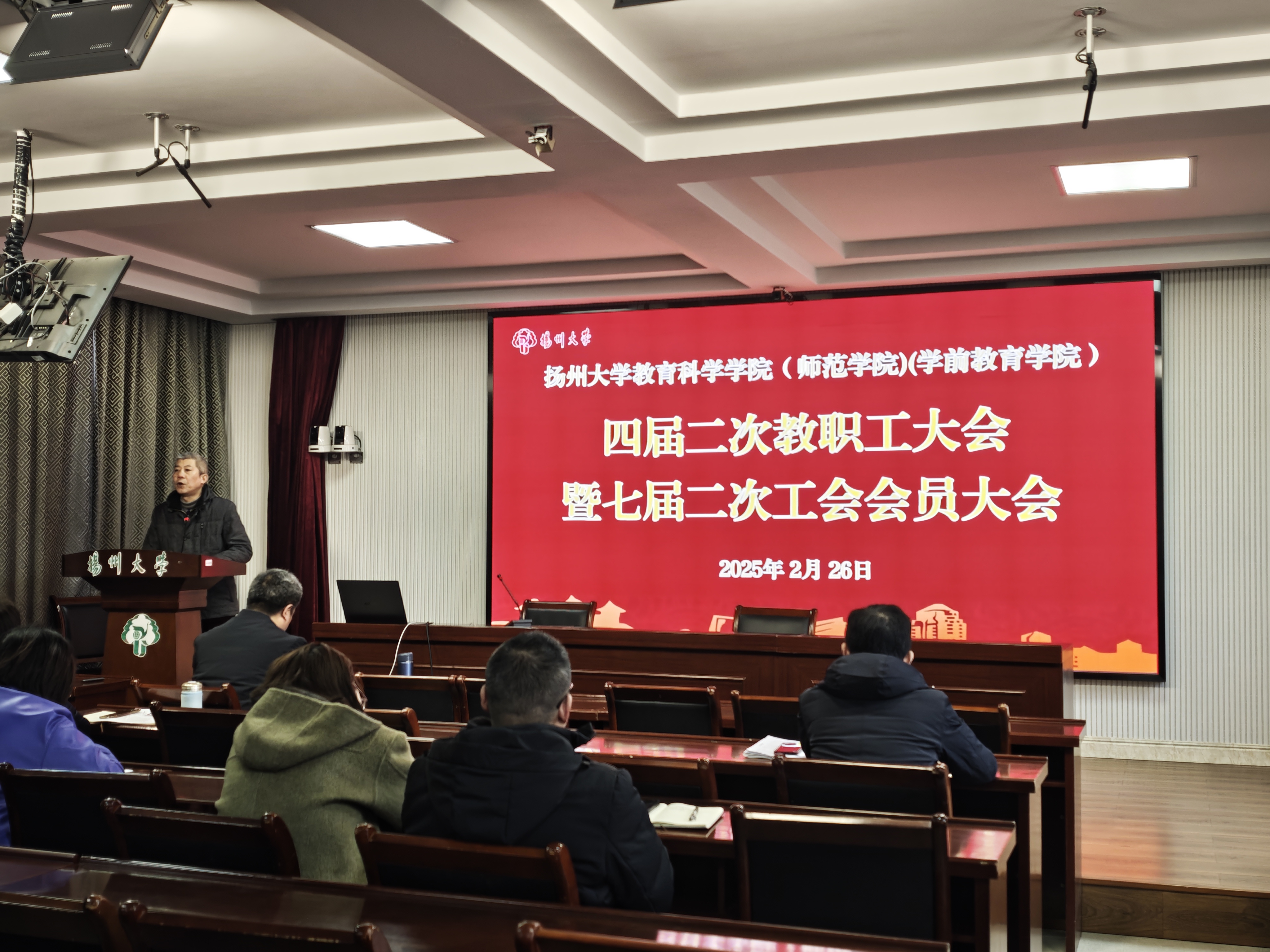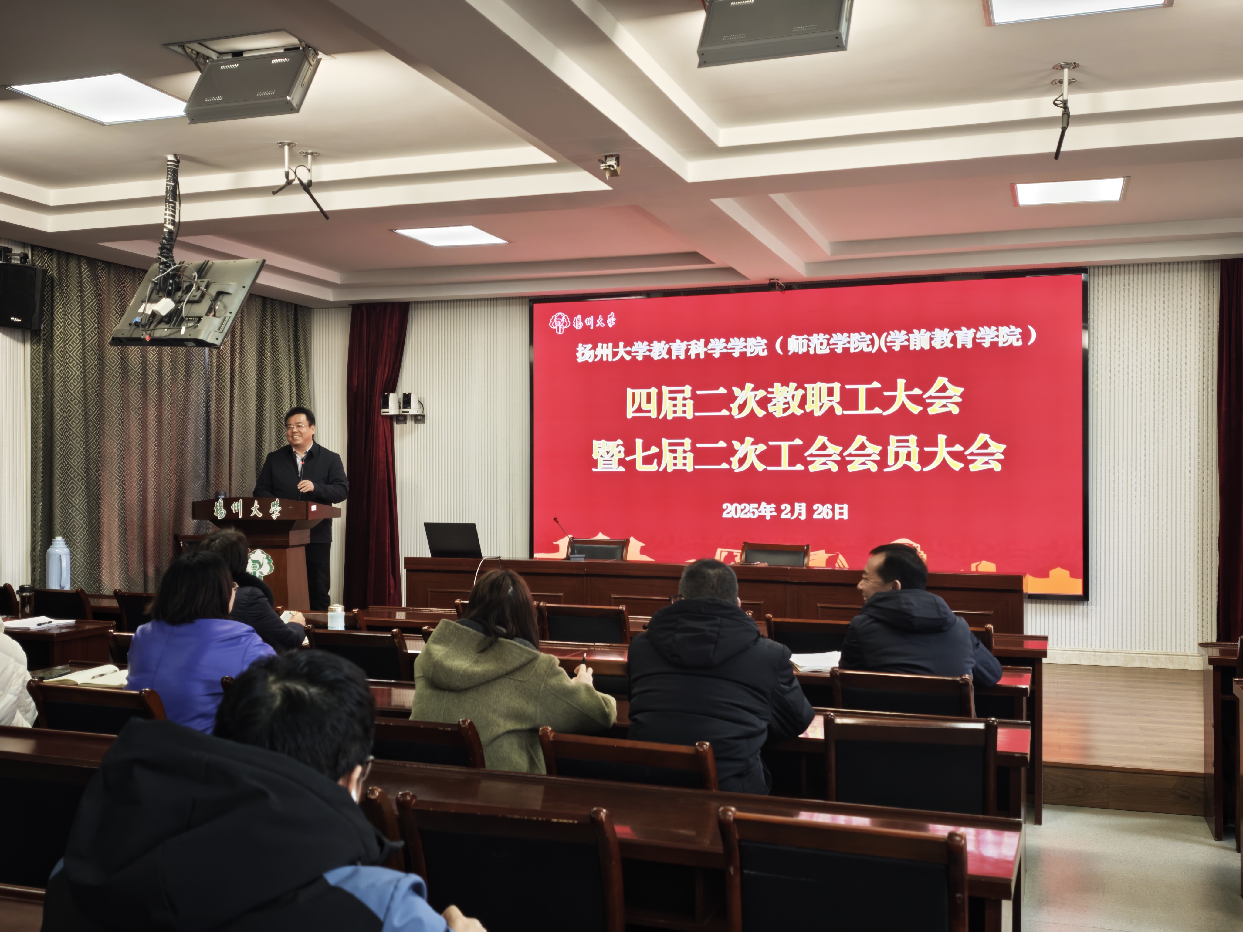 2025年2月26日下午,学院在教科楼西附楼二楼报告厅召开四届二次教职工大会暨七届二次工会会员大会。会议由院党委杨咏书记主持,全体教职工参加大会。