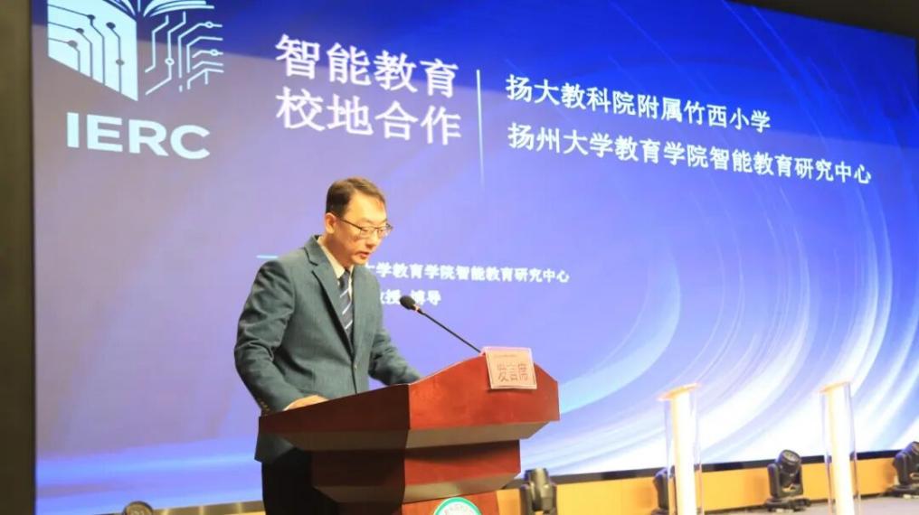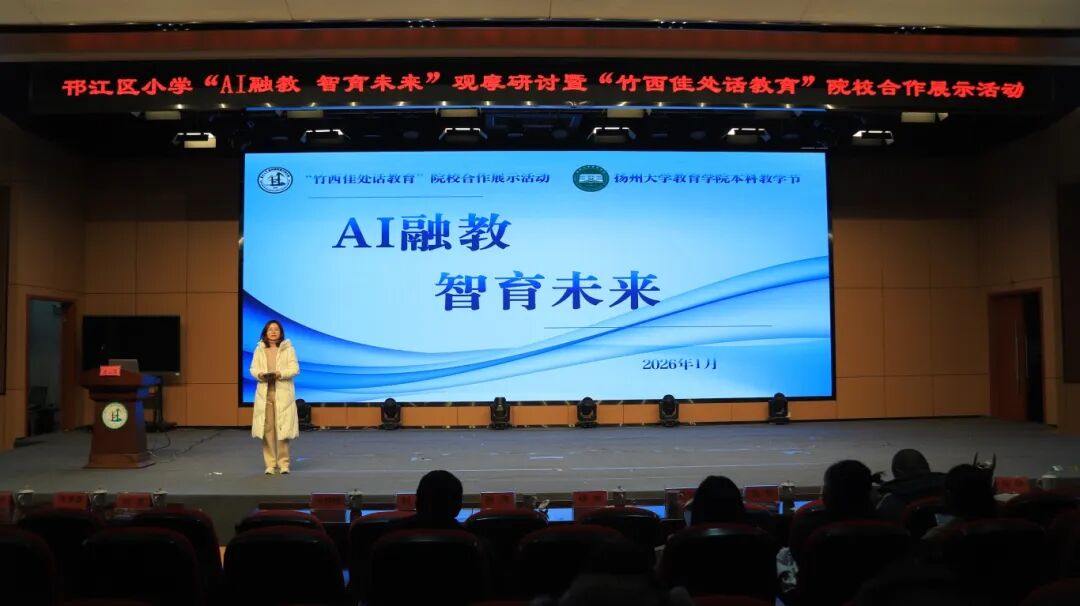 1月6日,由扬州大学教育学院、邗江区教育局联合主办,扬州大学教科院附属竹西小学承办的“AI融教,智育未来”观摩研讨暨“竹西佳处话教育”院校合作展示活动在竹西小学圆满举行。扬州大学教育学院党委书记杨咏、院长张浩、副书记朱鑫铨、副院长刘牧,师生代表70余人,以及邗江区教育局、竹西街道办事处领导、邗江区各学校教师代表、竹西小学家长代表参加了本次活动。