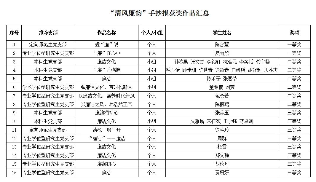 为进一步加强学生廉洁自律意识,营造风清气正、崇廉尚洁的校园文化氛围,我院近期顺利举办“清风廉韵”手抄报比赛。经由学生支部推荐,累计收集29件作品,最终评选出一等奖2名、二等奖6名、三等奖8名