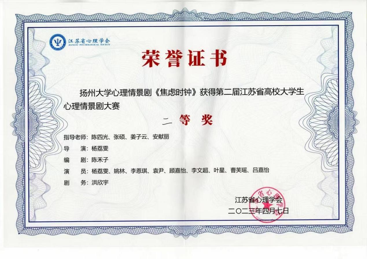 4月7日,江苏省第二届高校心理情景剧大赛决赛在东南大学举行。本次比赛共有129项作品参赛,经过激烈角逐,我院选送的心理情景剧《焦虑时钟》荣获二等奖。