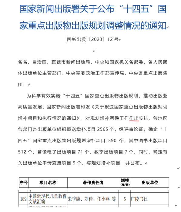 近日,国家新闻出版署公布《“十四五”国家重点出版物出版规划调整情况的通知》,我院朱季康教授、刘佳教授的专著喜获立项。
