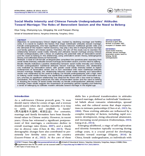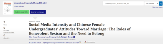 论文信息:Yang, D., Lyu, Z., Xie, Q., & Zheng, P. (2025). Social Media Intensity and Chinese Female Undergraduates’ Attitudes Toward Marriage: The Roles of Benevolent Sexism and the Need to Belong. International Journal of Sexual Health DOI:10.1080/19317611.2025.2583154