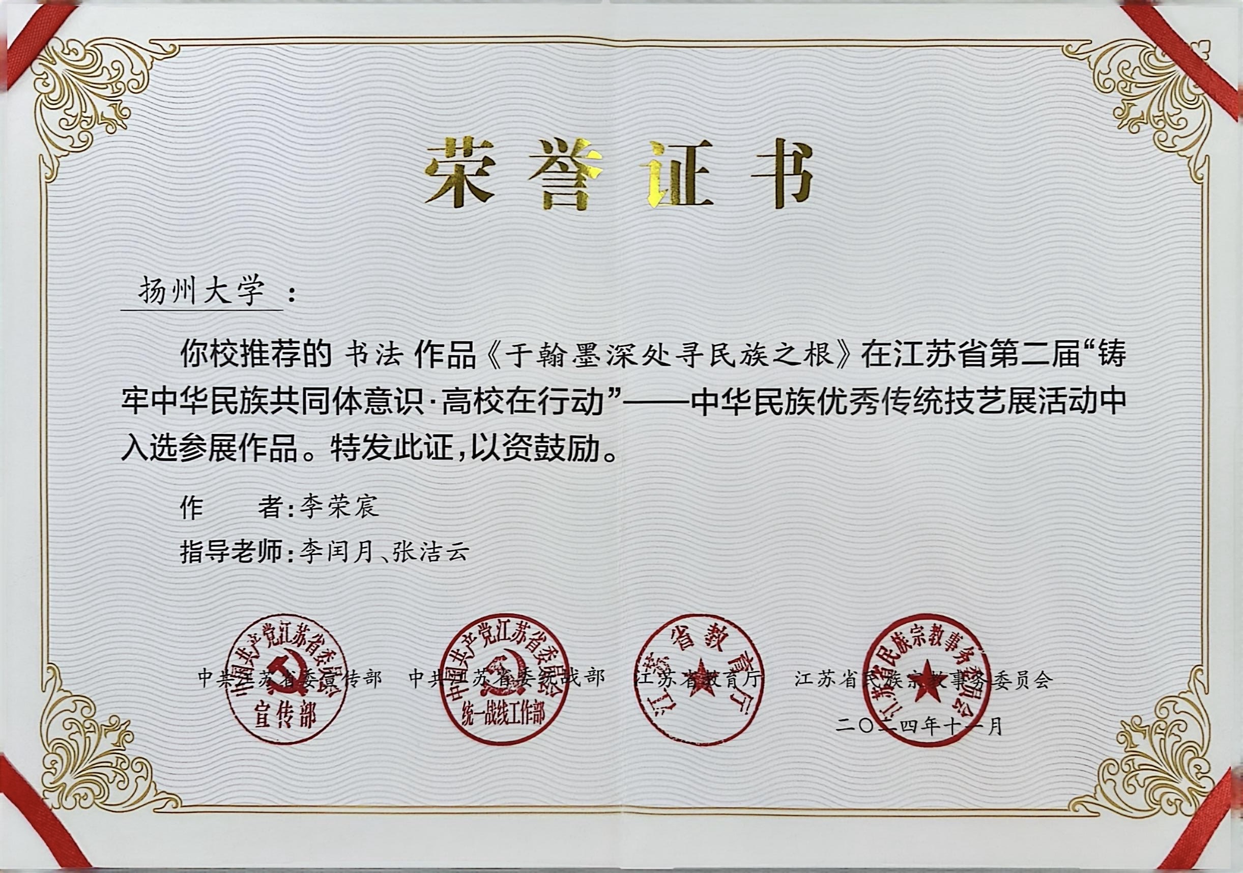 我院李荣宸书法作品《于翰墨深处 寻民族之根》入选江苏省第二届“筑牢中华民族共同体意识 高校在行动”中华民族优秀传统技艺展。
